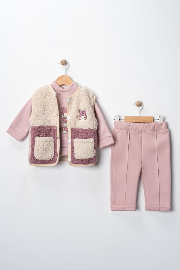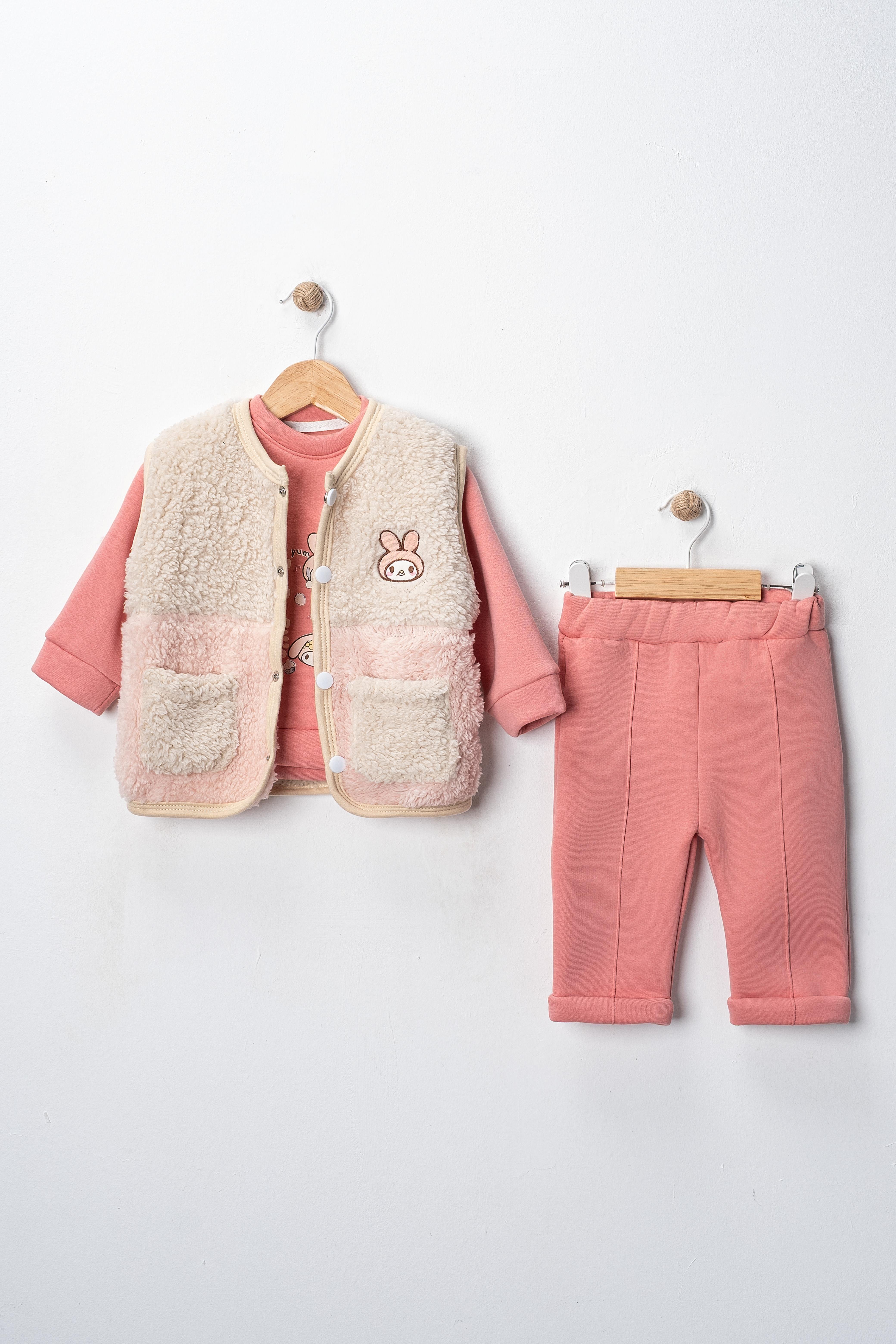 Takım, yelek, t-shirt ve pantolondan oluşmaktadır. Yelek, kaliteli welsoft kumaşından üretilmiş olup, hafif bir sıcaklık sağlayarak kış aylarında bebeğinizin korunaklı kalmasına yardımcı olur. Üzerindeki sevimli desenler ve renk uyumu, küçük kızların seveceği şekilde özel olarak hazırlanmıştır.
