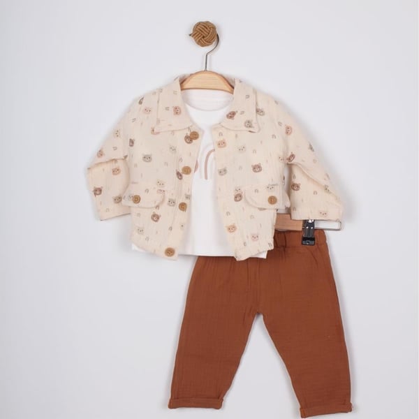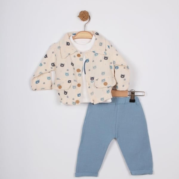 Kardelya Baby erkek bebek ayı baskılı 3'lü takım, küçük prenslerin rahatlığı ve şıklığı için özel olarak tasarlandı. Bu tatlı takım, sevimli ayı deseni ile bebeğinizin giyinmesini daha da keyifli hale getirecek.