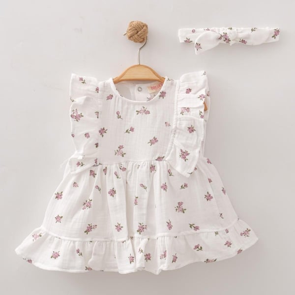 Elbisenin %100 pamuklu kumaşı, bebeğinizin cildini tahriş etmeden rahat bir kullanım sunar. Mor rengin büyüleyici tonları ve zarif çiçek desenleri, her ortama uyum sağlayacak şekilde özenle seçilmiştir. Fırfır detayları, elbiseye hem neşeli bir hava katmakta hem de moda dünyasında trendleri yansıtmaktadır.