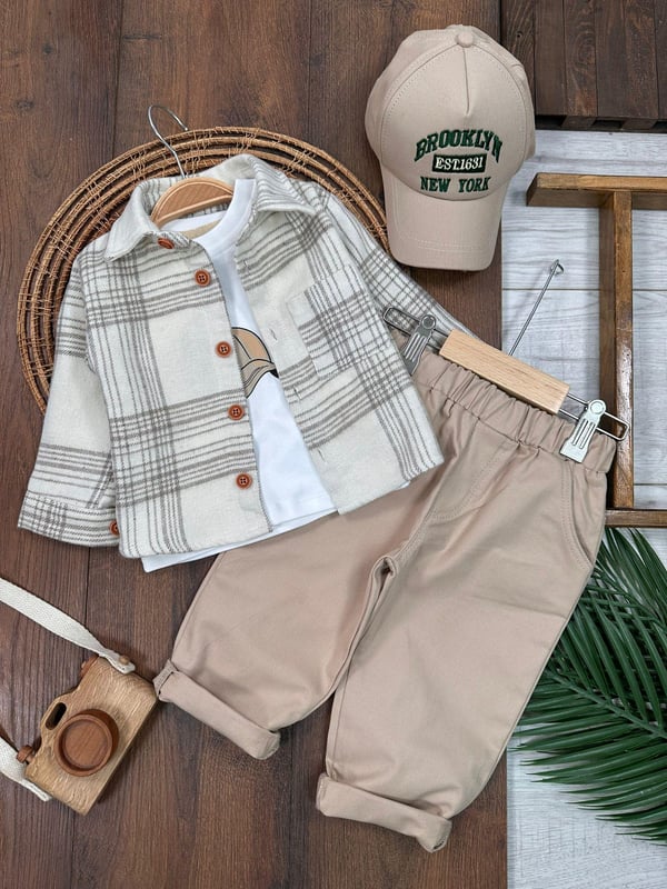 Takımın oduncu desenli gömleği, modanın trendlerini yansıtarak hem şık hem de spor bir görünüm sunar. Gömleğin klasik kesimi, her yaştan bebeğe uygun bir tarz oluştururken, pantolonun şık ve sade tasarımı, tişört veya gömlekle mükemmel uyum sağlar. Kasket, tamamlayıcı bir aksesuar olarak, tüm setin şıklığını artırırken, gün boyu dış mekan aktivitelerinde ve oyunlarda da koruma sağlar.
